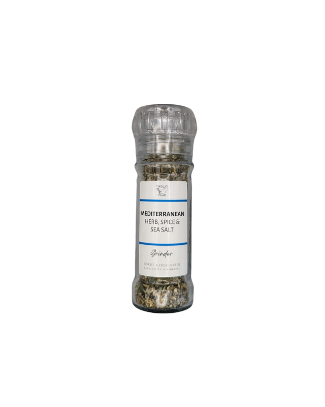 At Dorset Blends all our Salt Blends are hand crafted. Our Mediterranean Salt Grinder encourages you to recreate your holiday at home with our versatile herby Salt Blends! Our use of whole spices and herbs, typical Mediterranean, combine to release their oils and fragrance ensuring a fresh burst of flavour with each twist or grind, making our Dorset Blends Mediterranean Salt Grinder very different from infused salts. A blend that will go with just about anything, use our Mediterranean Salt Grinder to pair with chicken, seafood, and pasta. Or why not try this Dorset Blends family favourite - mix our Salt Blends with butter, chill, and serve on warm bread. Make sure to give your Mediterranean Salt Grinder a ‘Shake ‘n’ Wake’ each time to keep your Salt Blends well mixed! ALLERGENS Ingredients: NONE. Other Ingredients: Natural Coarse Sea Salt, Thyme, Oregano, Rosemary, Marjoram, Tarragon, Basil, Parsley, Back Peppercorns, Dried Minced Garlic, Dried Minced Onion, Ground Rice 50g